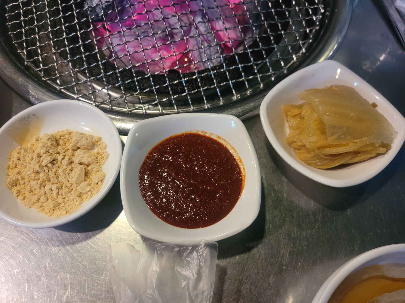 매콤하게 맛있는 양념장에 묵은지, 콩가루가 소스로 제공되요.