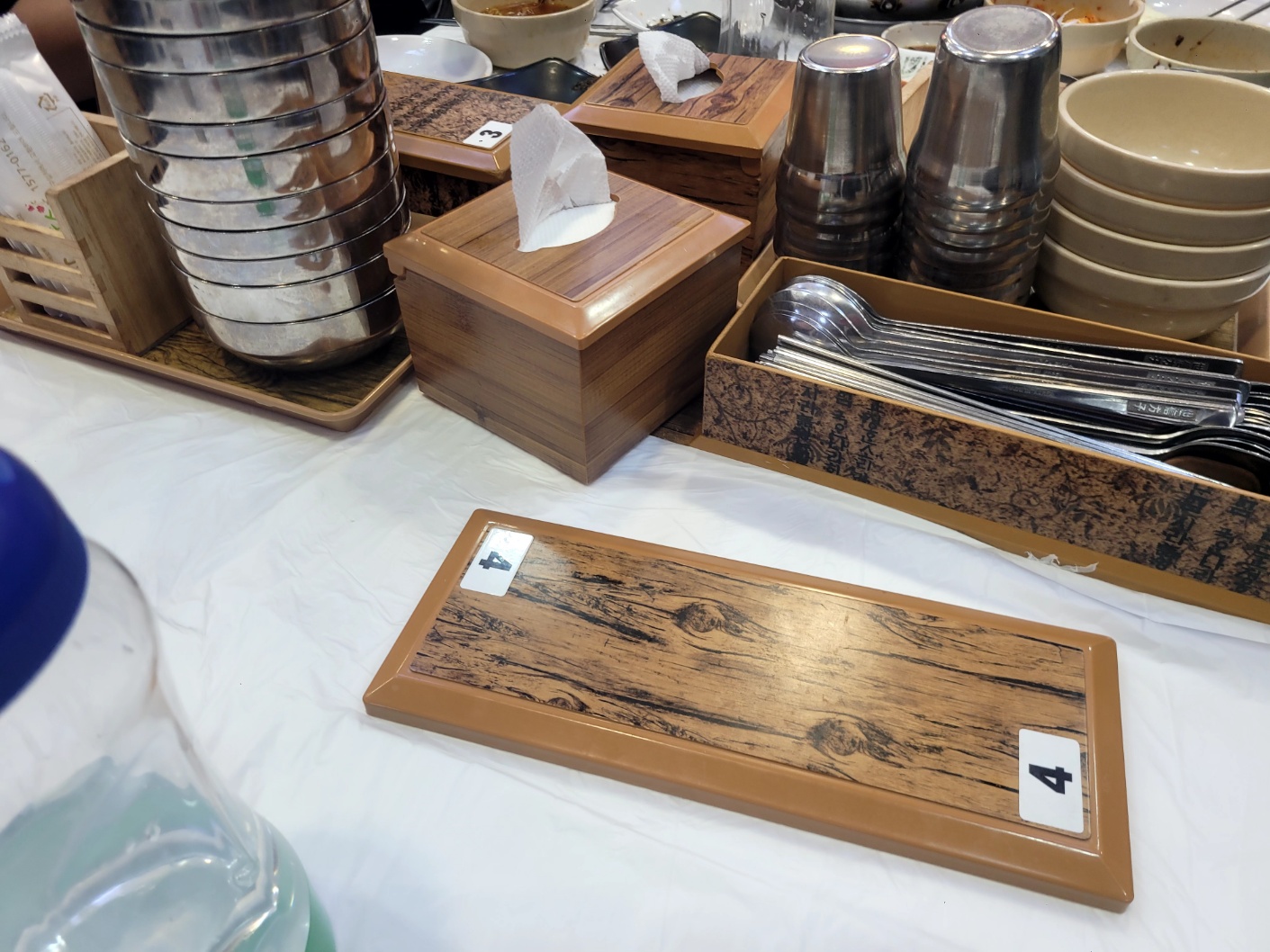 테이블마다 수저와 냅킨, 물티슈, 물컵, 앞접시가